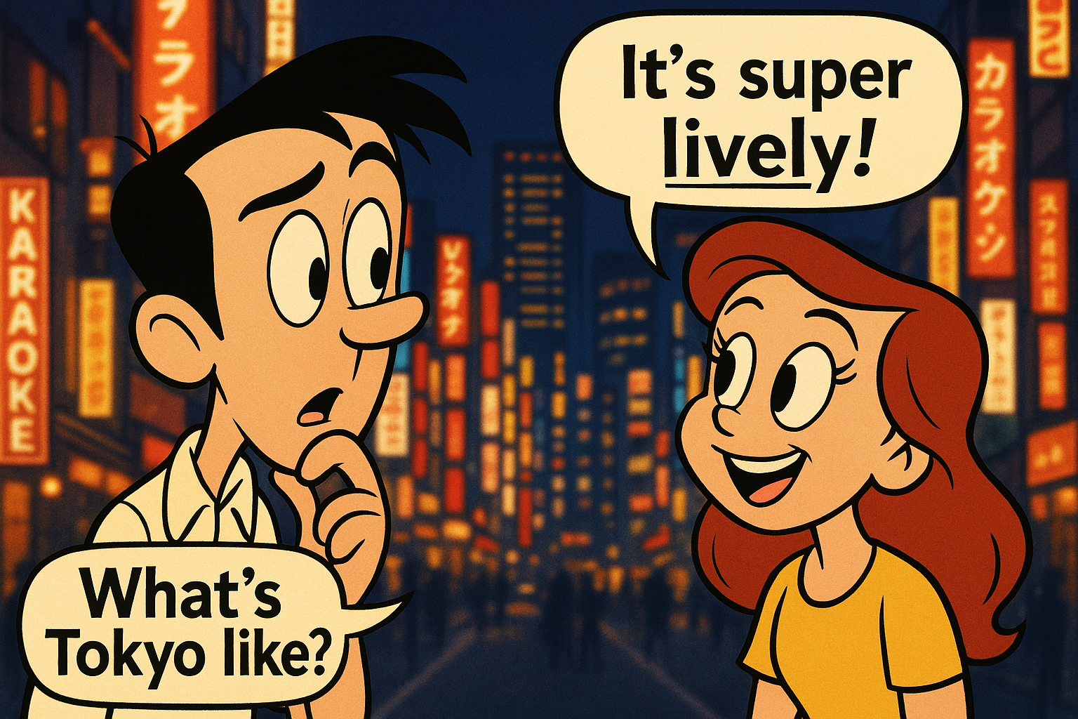 Note: Use adverbs like ‘pretty‘, ‘fairly‘ & ‘super‘ before adjectives to sound more natural and precise. E.g. It’s a pretty small city/ It’s fairly boring here/ It’s a super interesting place.