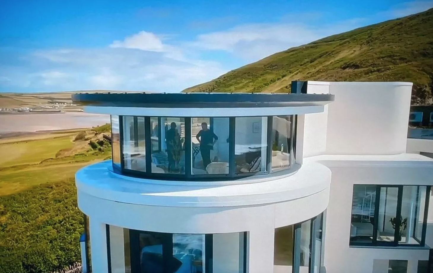 Well, by Neptune, there is at least a lighthouse. Oh my giddy aunt, the rotunda punctures the skyscape and stands so proudly on this headland as if it had always been there. That looks finished. I mean, that is oh superb, and it’s got furniture in it. I mean, somebody’s living here. That’s it. Oh my lord, it’s a complete complex of buildings. Wow. The entire new wing to this building is now in place, and it is huge. A 3D grid of steel, glass, and white render that together sing of the romance of Art Deco, as does the 60 ft long infinity pool. Oh, the pool is full and lapping where once there was slumped a barnacle of botched ambition, there now stands a defiant monument to perseverance. It’s the kind of thing that a billionaire oligarch would put out off the coast of Greece, you know. Skos to my left, Bristol Channel to my right. Only from the sea can you fully appreciate the vastness of this place, but as you weave to the back of the building, there’s a more secluded, less formal character to be found, albeit still on a grand scale. Wow. Everything here is epic: epic architecture, epic rock face, epic motorway flyover.