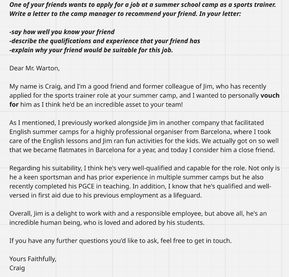 One of your friends wants to apply for a job at a summer school camp as a sports trainer. Write a letter to the camp manager to recommend your friend. In your letter: