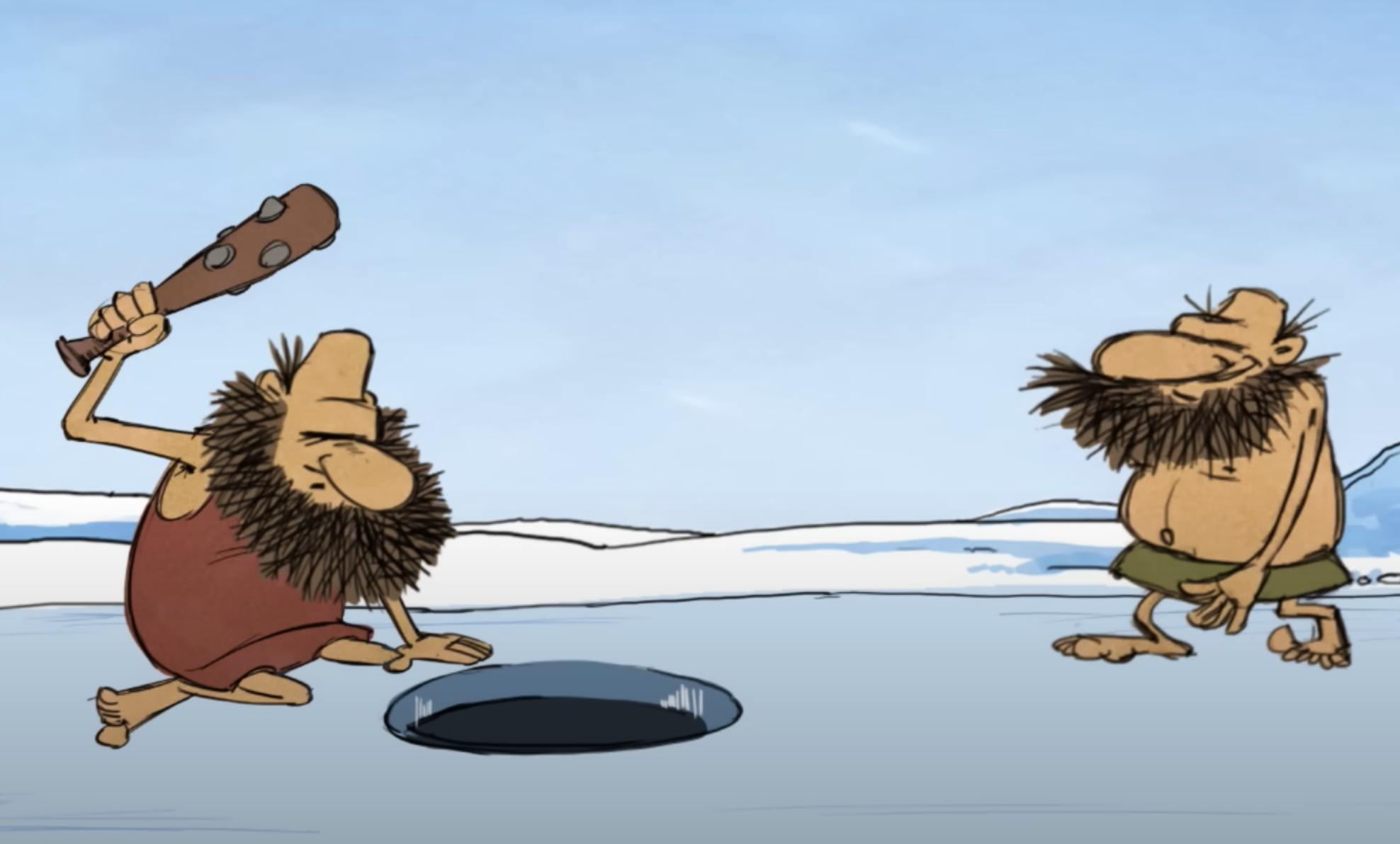 We start off by seeing a caveman looking into a hole looking ready to hit something. His mate comes along but he ignores him. He sees a fish pop up out of the water and he took a swing at it. Unfortunately he didn’t hit it though, and his mate laughed at him. The green caveman then came up with a plan to catch the fish more effectively involving a harpoon and diving gear. He took the red caveman’s club, chucked it in the water and came back with all the gear. After that, he forced the green caveman into the water while he supplied oxygen using a pump. After a moment of looking around and getting ready to hunt, the red caveman freaks out because he can’t breathe.