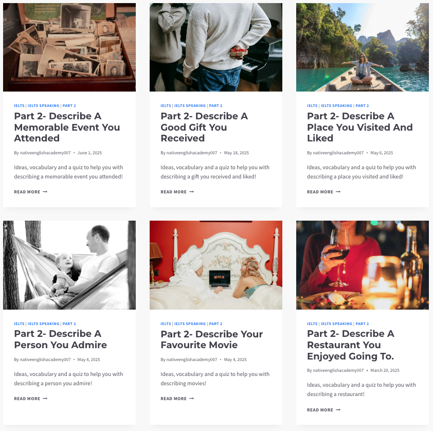 Technology Family Buildings Transport Nature/ Environment Shopping Health Weather Education Home Check out IELTS Part 2 Questions, Samples & Practice here! Vocabulary Review: Try these 5 short stories to see how much you remember! Vocabulary Review with Jack and Cindy’s Trip to the countryside! Have you Mastered this typical Part 1 Speaking Question yet? Common Part 1 IELTS Speaking Questions- Do you Work or Do you Study? Learn How to speak about Preferences! (Common for Part 1 Questions!) Do you Prefer Tea or Coffee?