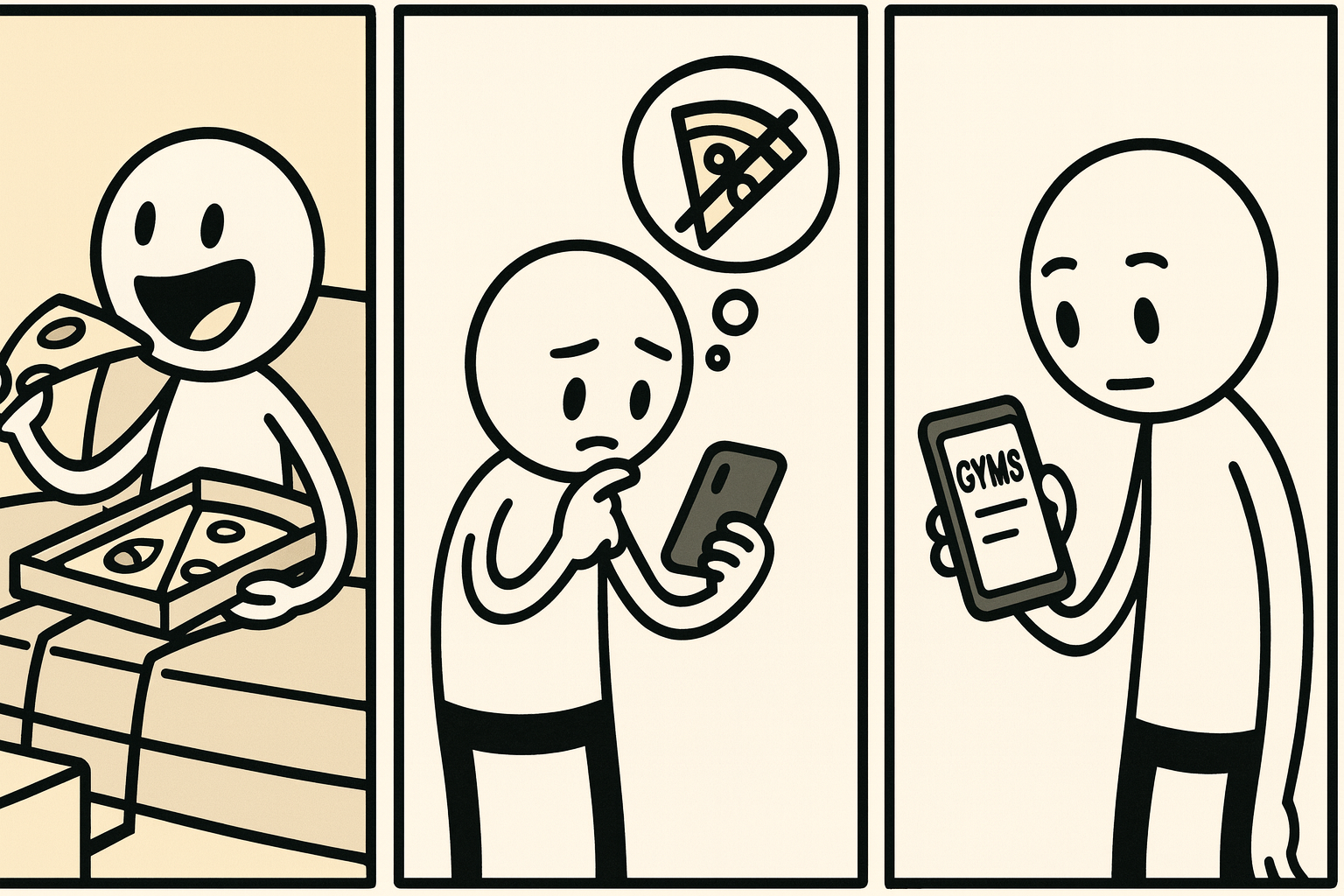 The guy is binging on pizza, realises that he has to cut down on it and looks up gyms in his area.