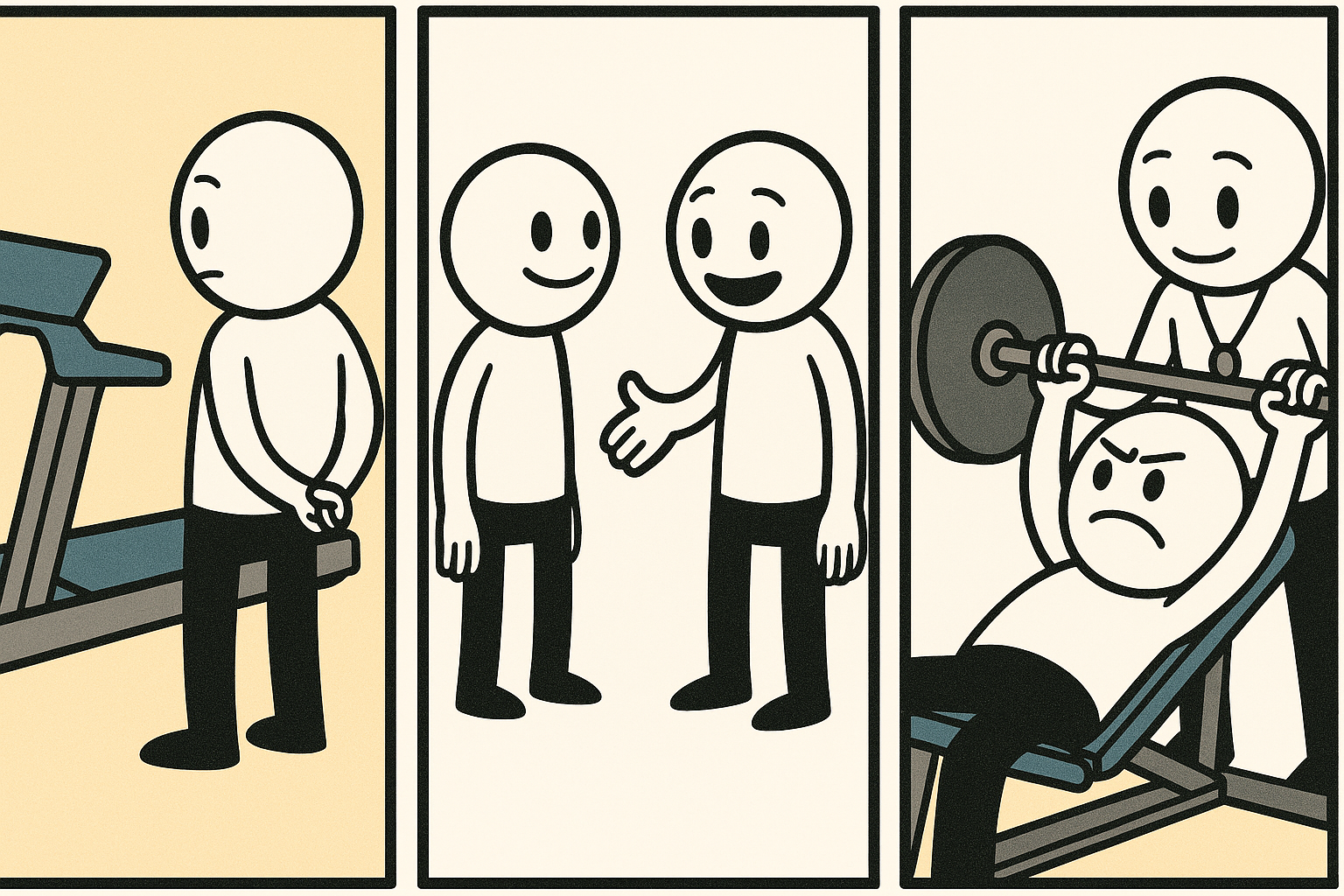 He checks out the gym equipment, bumps/runs into someone and works out with a personal trainer.