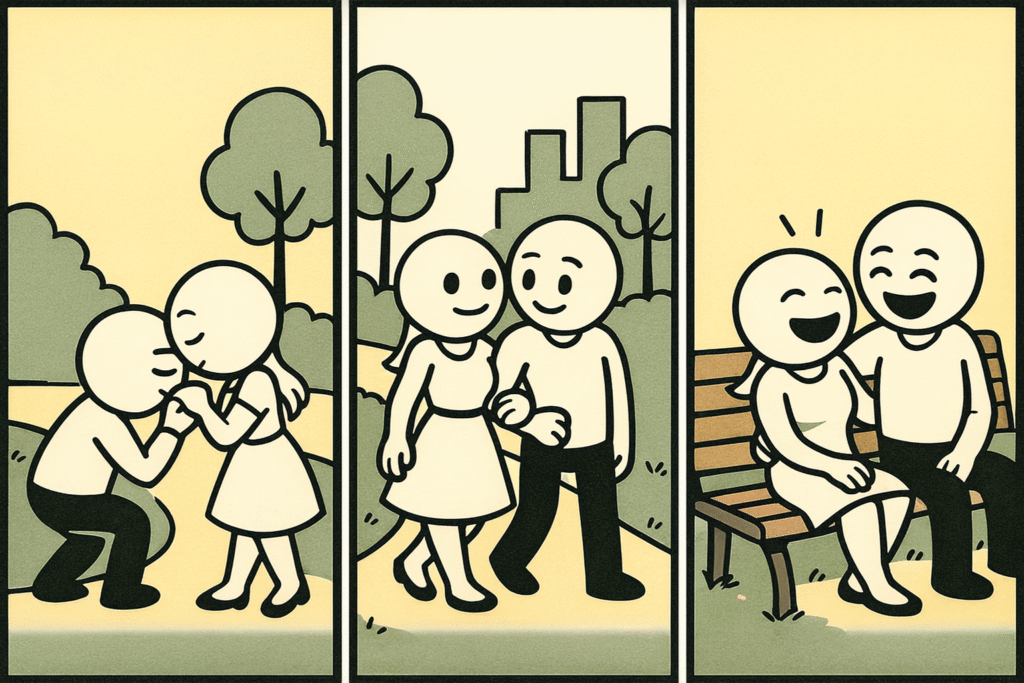 He then meets up with a girl, walks around the park with her, and it seems that he gets on well with him.
