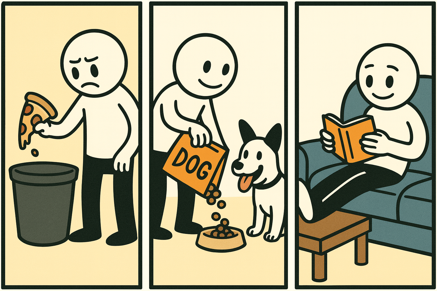 When he’s home, he gets rid of his pizza, looks after the dog by feeding it and chills out on the sofa with a book.