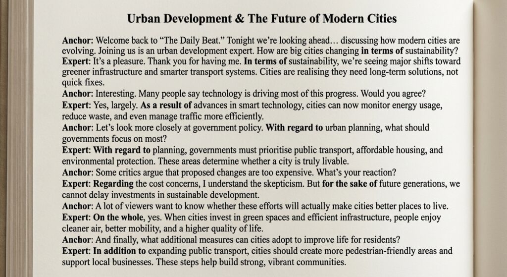 Using sophisticated prepositional phrases to introduce your ideas shows grammatical range. Read the following news dialogue and notice how these prepositional phrases are used.