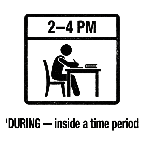 DURING = Inside a Period (An action/event happens at some point within a larger time block.)